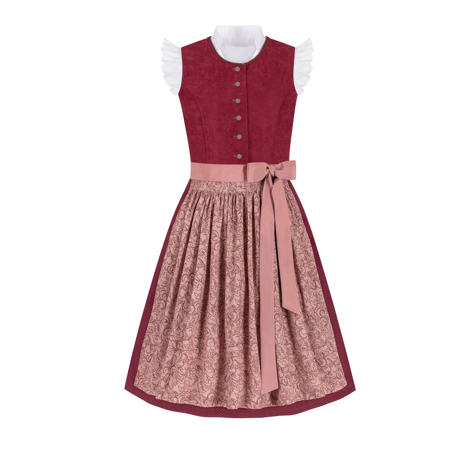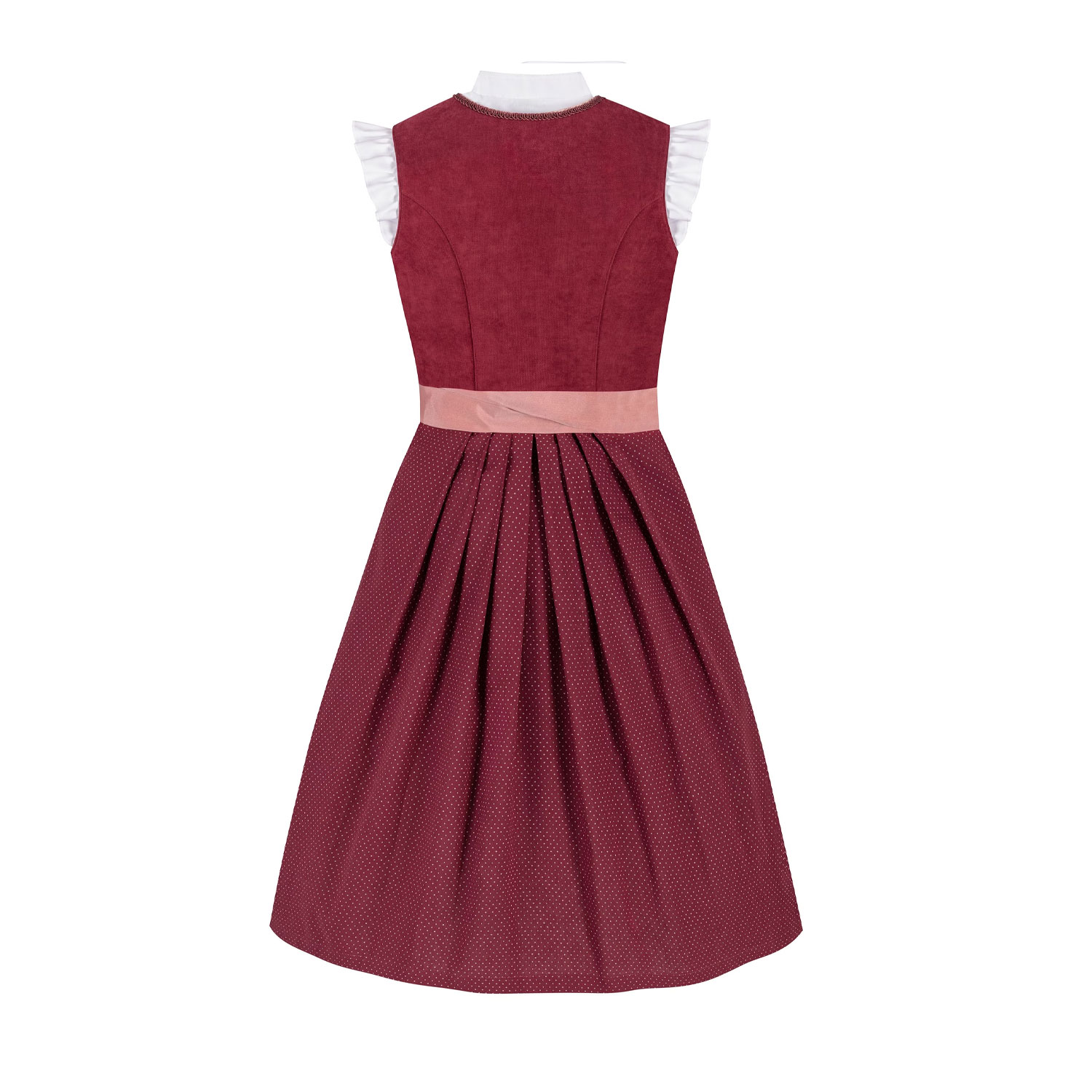 This elegant children’s dirndl features a stylish high-neck design for a refined and traditional look. The top is made from red velvet cord, offering both comfort and a luxurious appearance.