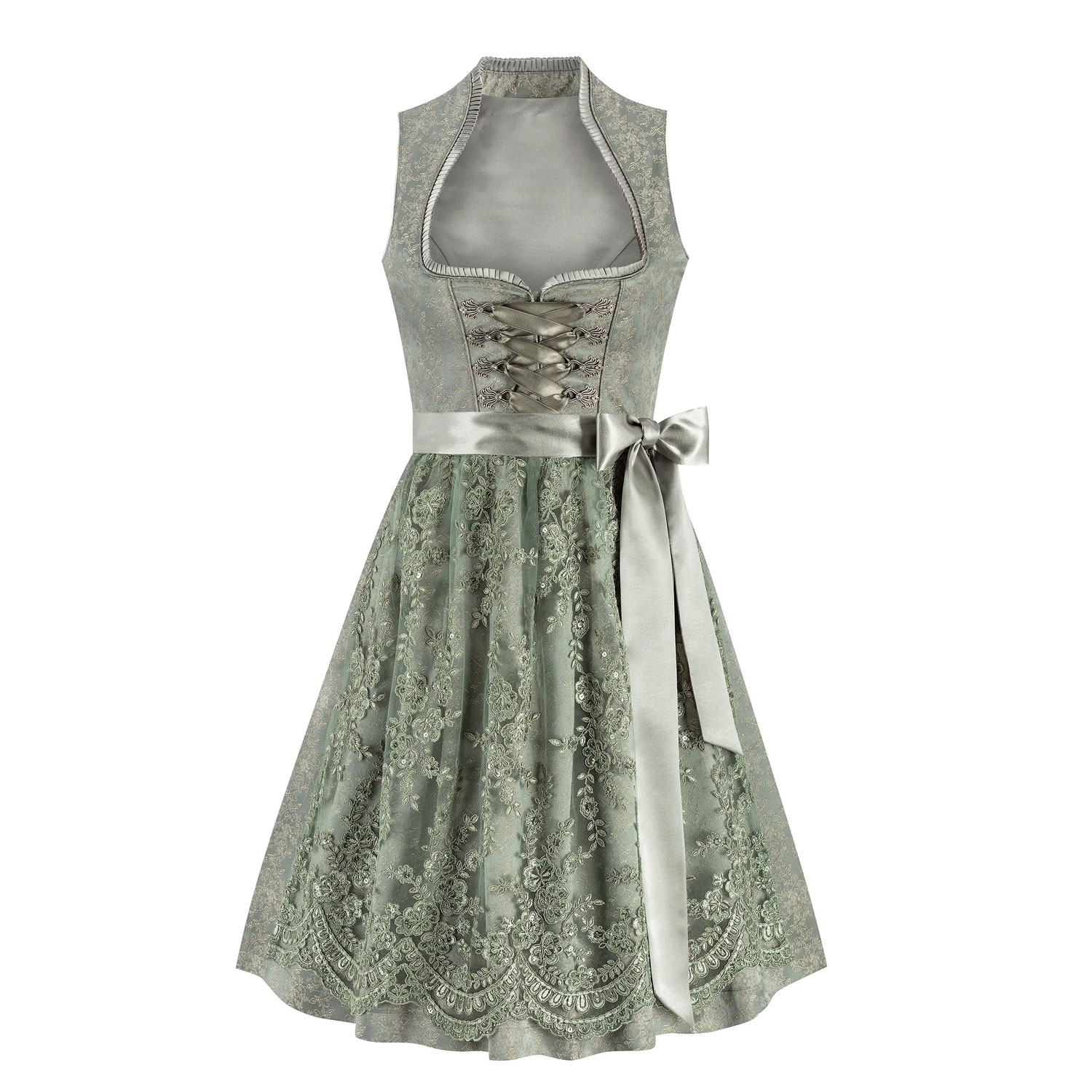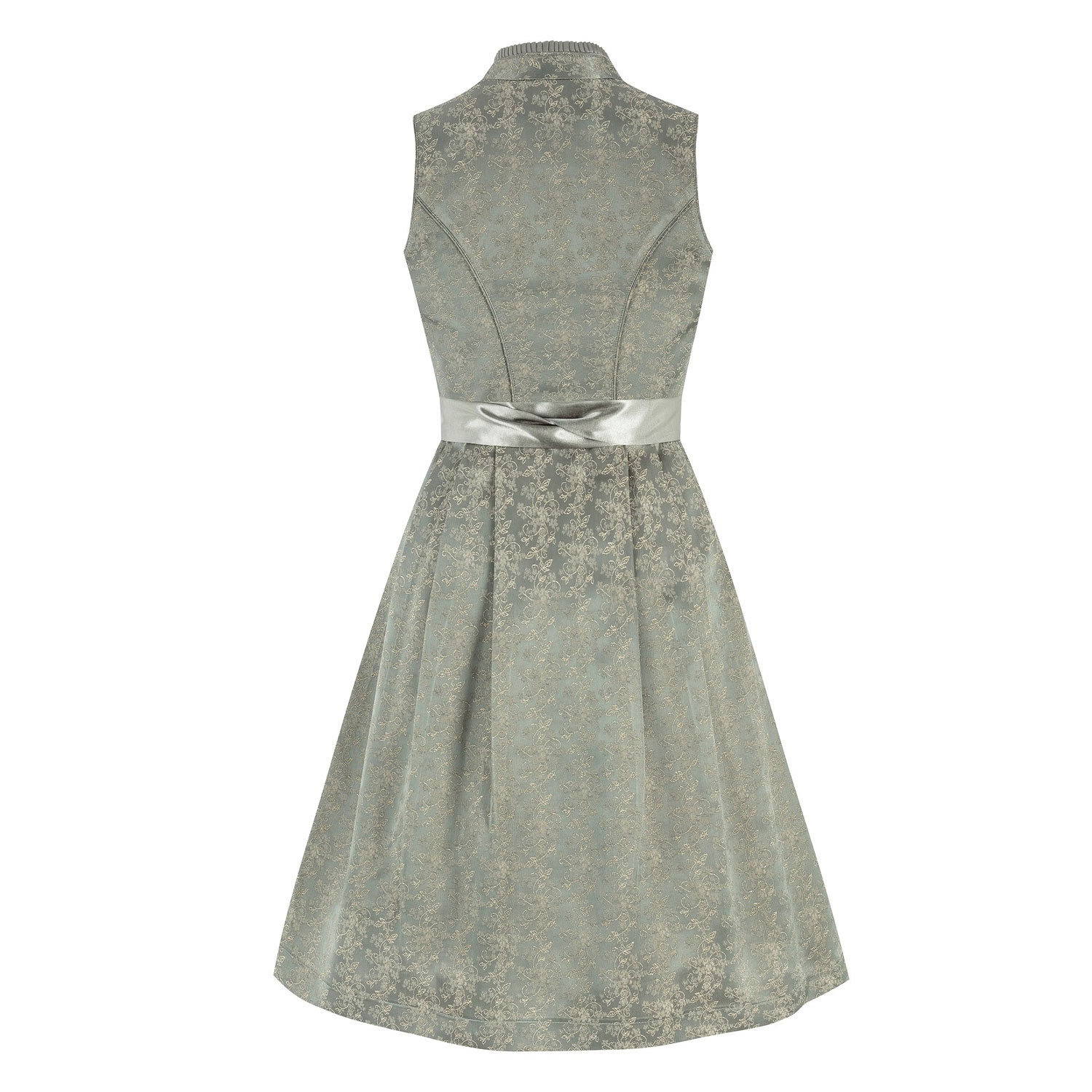 This elegant green mini dirndl features a flattering heart-shaped neckline accented with refined pleated trim for a sophisticated touch. It is crafted from fine brocade fabric with a beautiful floral pattern, adding texture and timeless charm.
