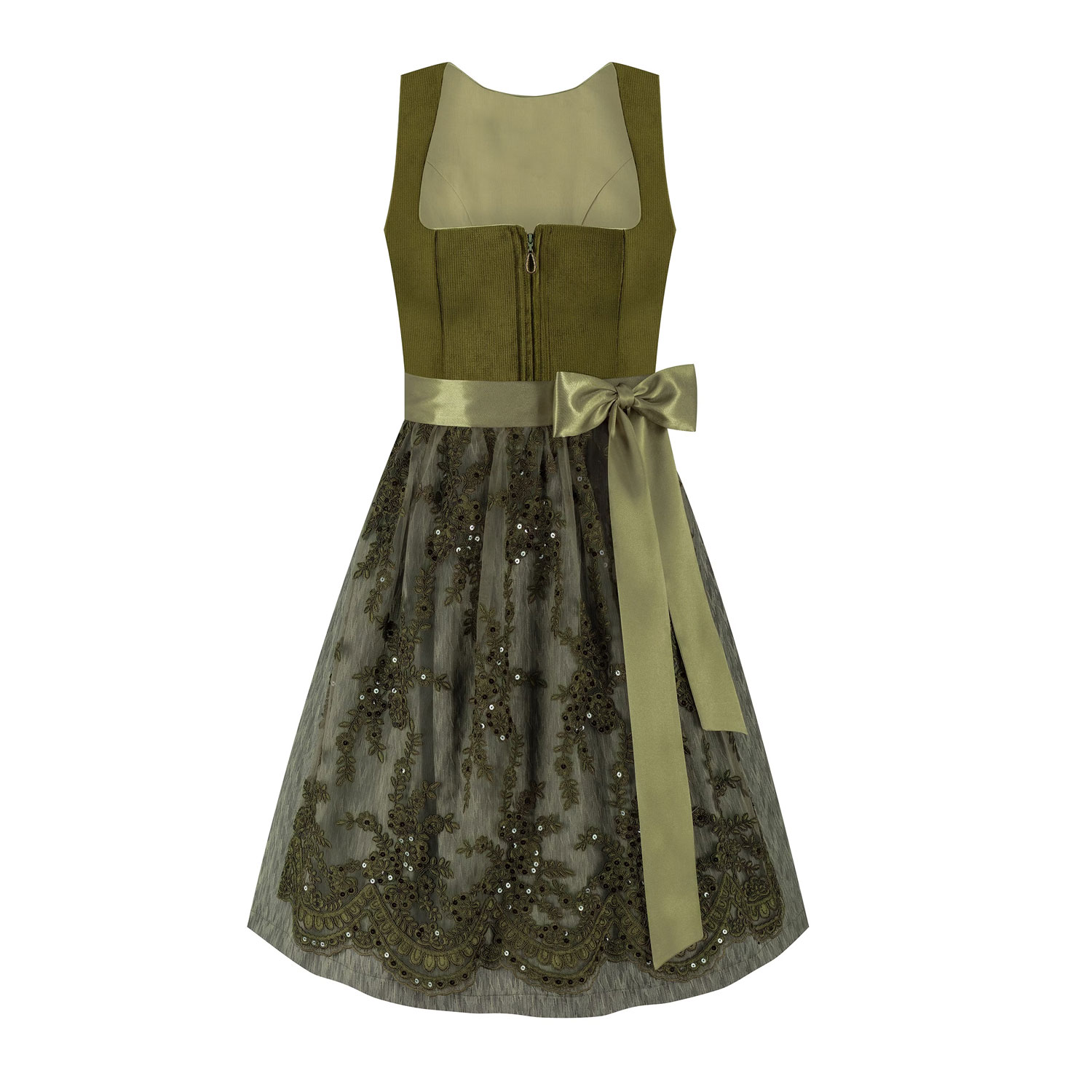 This elegant mini dirndl in olive green features a 60 cm skirt length, offering a stylish blend of tradition and modern design. The bodice is crafted from soft velvet cord with a flattering square neckline and finished with delicate satin piping for a polished look.